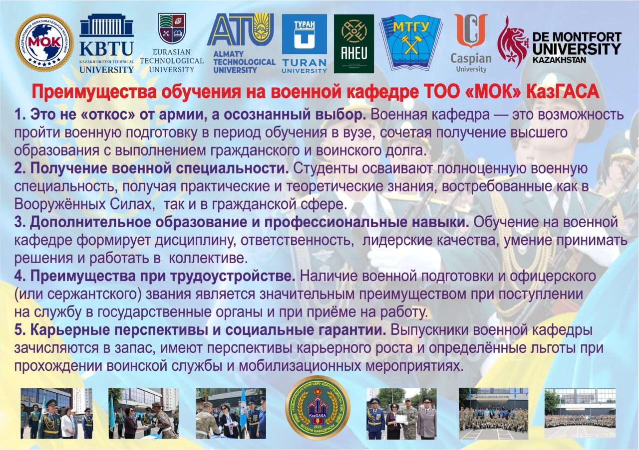 Military training is conducted under the state educational order and on a paid basis. Students of the International Educational Complex (IEC) who rank from the first position up to the number corresponding to the allocated places in the enrollment plan are eligible for free training at the military department.